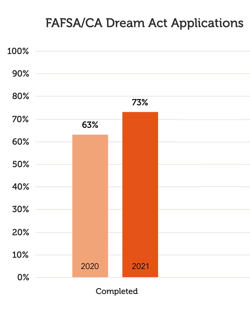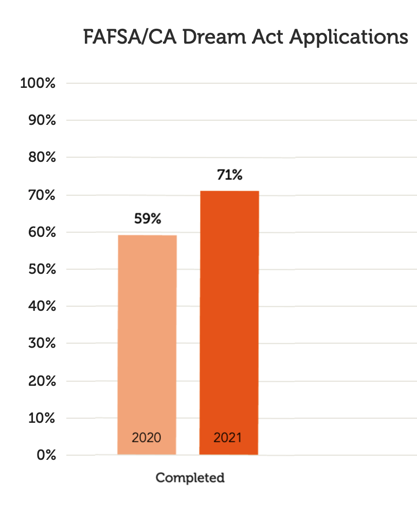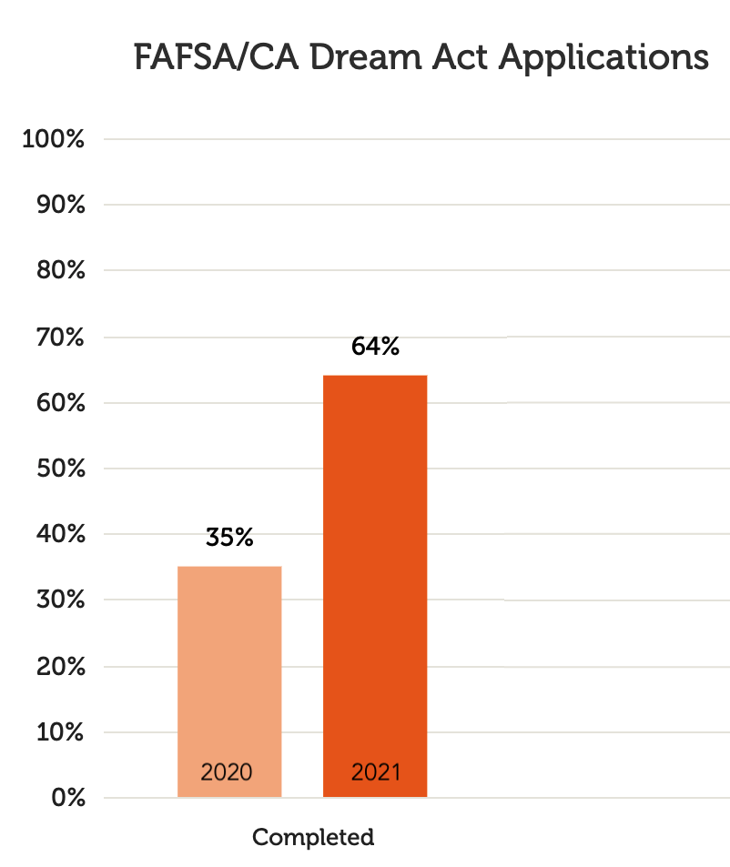 As a result of the district’s emphasis on integrated advising programs, three high schools in SFUSD saw increases in the number of FAFSA and Dream Act applications that students completed at a time when schools were anticipating a decline. From 2020 to 2021, Lincoln High School, Balboa High School, and Independence High School saw encouraging gains in completed applications of 12%, 10%, and 29% respectively.